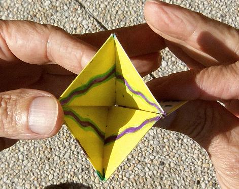 Keeping the flexagon squozen, reposition your fingers so that that your two thumb tips are moved up to the central top point.